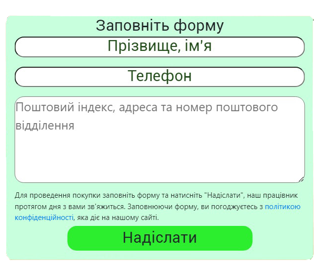 Для проведення покупки заповніть форму та натисніть "Надіслати", наш працівник протягом дня з вами зв'яжиться. Заповнюючи форму, ви погоджуєтесь з політикою конфіденційності, яка діє на нашому сайті.